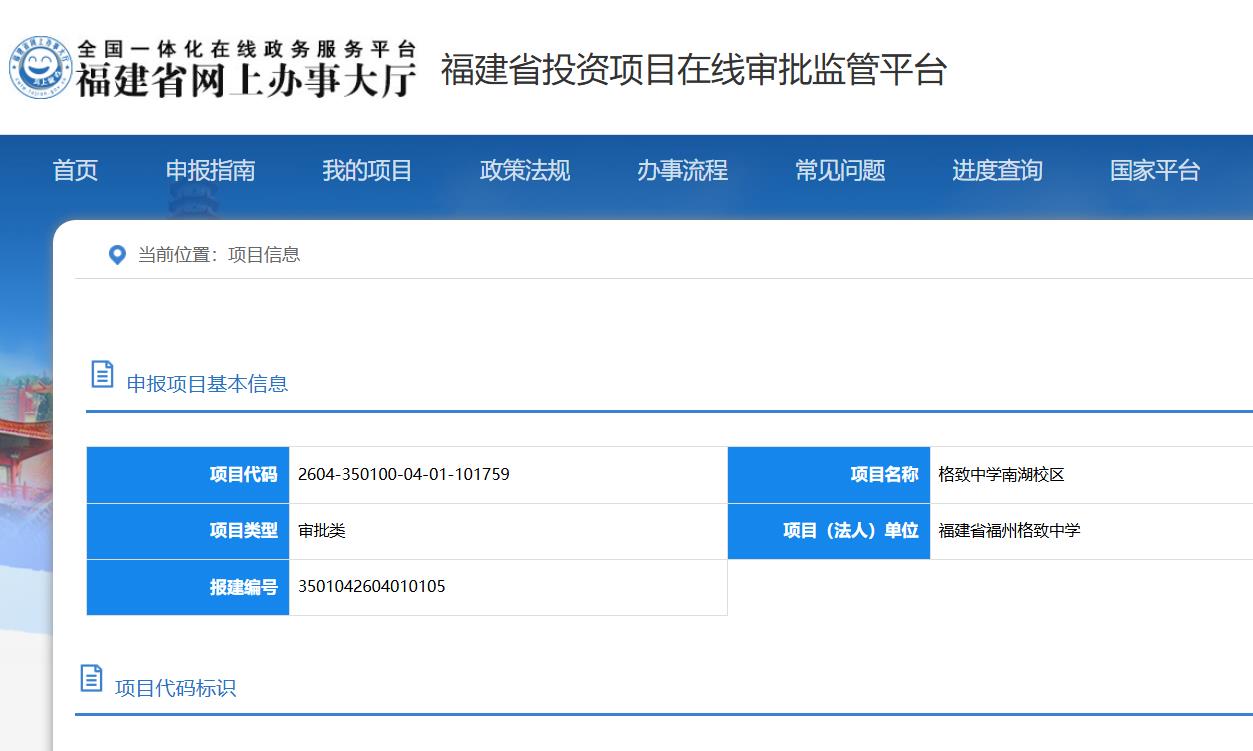 2026年4月1日,福建省投资项目在线审批监管平台发布信息显示,“格致中学南湖校区”已取得审批类报建。该项目代码为2604-350100-04-01-101759,报建编号3501042604010105,项目(法人)单位为福建省福州格致中学。