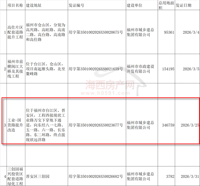 其中,工业-国货路提升改造工程已于3月5日取得选址意见书;发证编号:用字第3501002026XS0023677号;发证编号:用字第3501002026XS0023677号;建设单位:福州市城乡建总集团有限公司;项目总用地面积:520.13亩