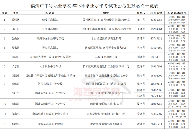 现将福州市中等职业学校2026年学业水平考试社会考生报名点公告如下: