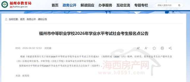 海西房产网(微信公众号:fjhxfcw)消息:4月2日,教育局发布“福州市中等职业学校2026年学业水平考试社会考生报名点公告”。