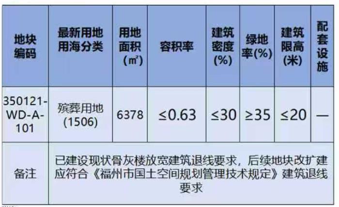 地块编号 350121-WD-A-101,用地分类为殡葬用地,用地面积6378平米,容积率小于等于0.63,建筑密度小于等于30,绿地率大于等于35,建筑限高20米。