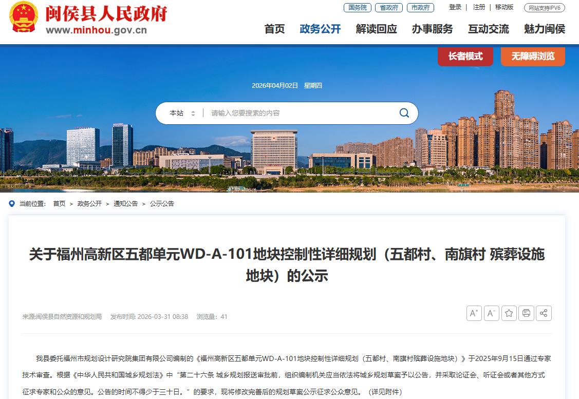 海西房产网(微信公众号:fjhxfcw)消息:2026年3月31日,闽侯县自然资源和规划局发布“关于福州高新区五都单元WD-A-101地块控制性详细规划(五都村、南旗村 殡葬设施地块)的公示”。
