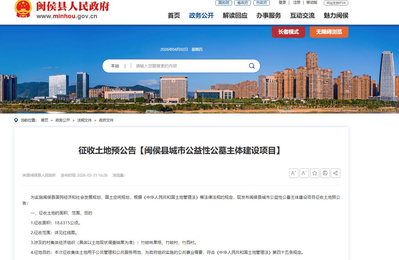 海西房产网(微信公众号:fjhxfcw)消息:2026年3月27日,闽侯县人民政府发布“征收土地预公告【闽侯县城市公益性公墓主体建设项目】”。