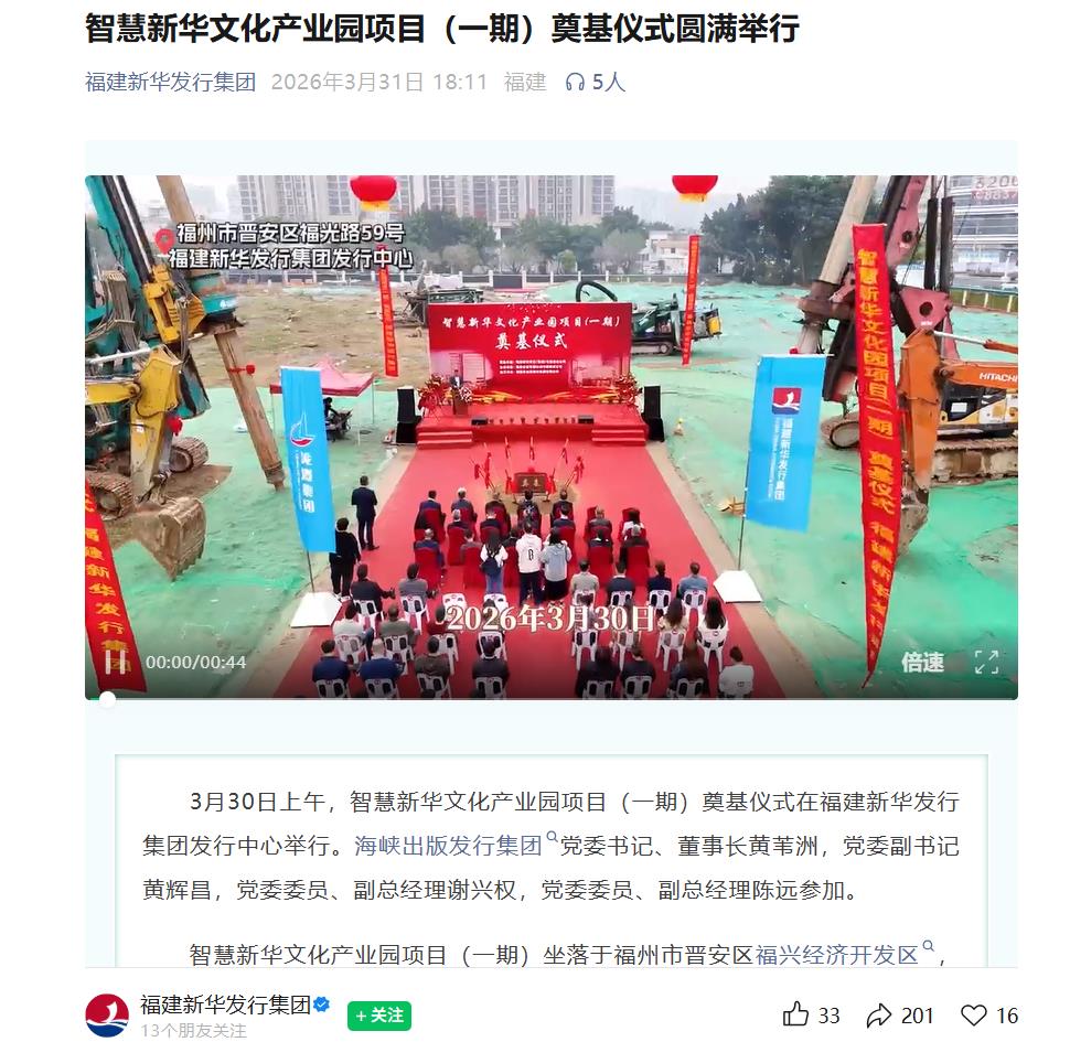 海西房产网(微信公众号:fjhxfcw)消息:据“福建新华发行集团”报道,3月30日上午,智慧新华文化产业园项目(一期)奠基仪式在福建新华发行集团发行中心举行。