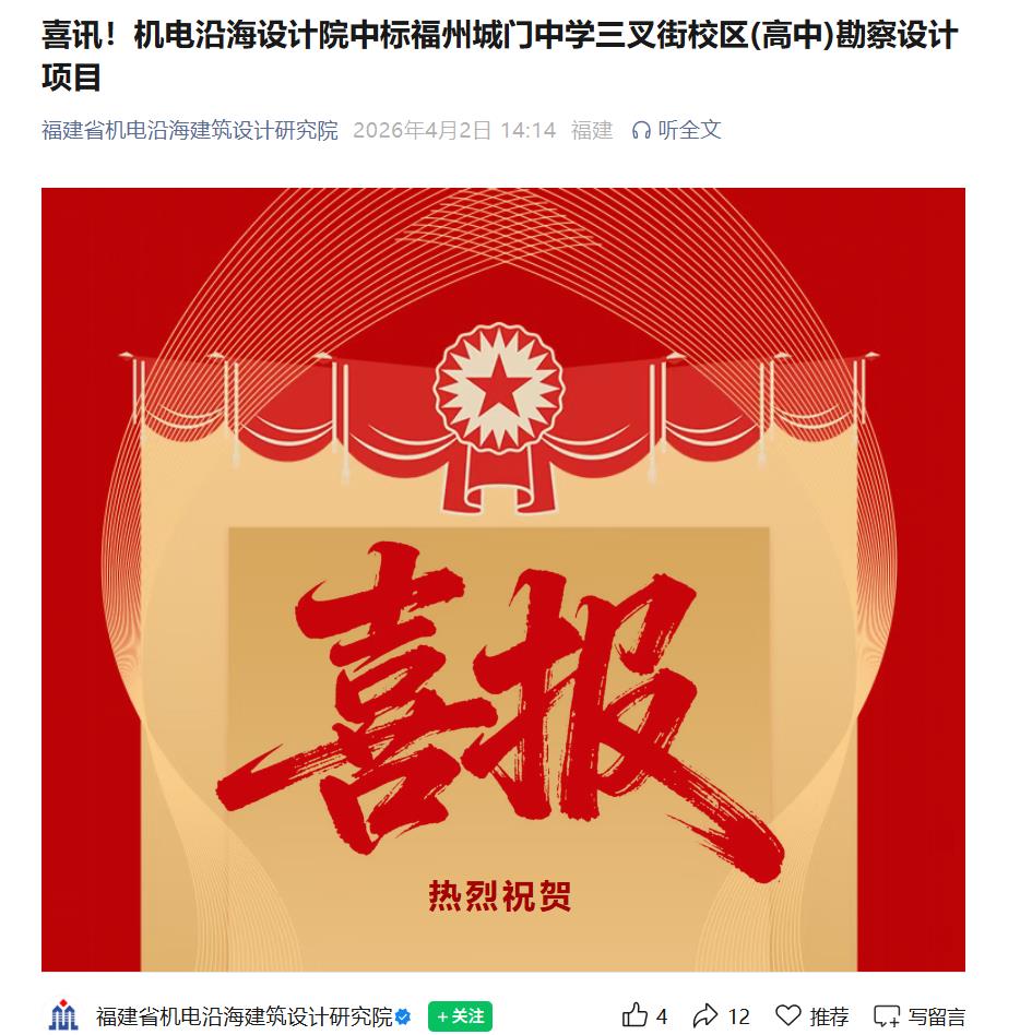 2026年4月2日,福建省机电沿海建筑设计研究院发文称,近日,机电沿海设计院再传捷报,凭借雄厚的技术实力、优秀的技术方案和良好的市场信誉,成功中标福州城门中学三叉街校区(高中)勘察设计项目。并曝光了一张效果图。