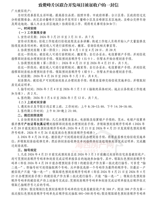 海西房产网(微信公众号:fjhxfcw)消息:4月2日,鳌峰片区联合开发项目房屋征收工作指挥部对外发布“致鳌峰片区联合开发项目被征收户的一封信”。
