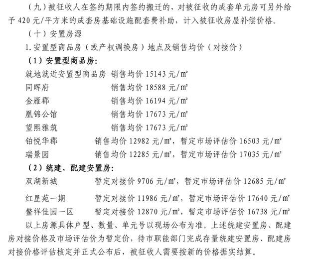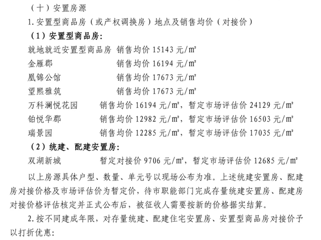 统建、配建安置房:双湖新城暂定对接价9706元/㎡,暂定市场评估价12685元 /㎡。