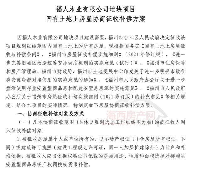 根据发布的《福人木业有限公司地块项目国有土地上房屋协商征收补偿方案》显示,该地块协商征收补偿的方式:实行货币补偿、对接购买安置型商品房或产权调换相结合的方式。