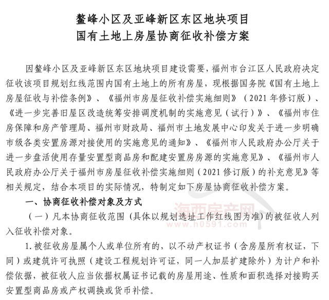 《鳌峰小区及亚峰新区东区地块项目国有土地上房屋协商征收补偿方案》显示,该地块协商征收补偿的方式:实行货币补偿、对接购买安置型商品房或产权调换相结合的方式。