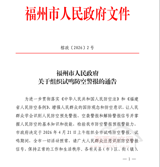 海西房产网(微信公众号:fjhxfcw)消息:4月3日,福州市人民政府发布“关于组织试鸣防空警报的通告(榕政〔2026〕2号)”。