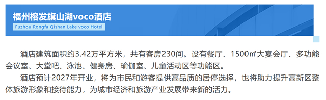 2024年11月20日,福州城投集团所属市建发集团与洲际酒店集团签约,2#楼旗山湖酒店定名为榕发旗山湖voco酒店,这也是福州首个正式落地的voco酒店品牌。