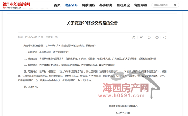 海西房产网(微信公众号:fjhxfcw)消息:4月2日, 福州市道路运输事业发展中心发布“关于变更99路公交线路的公告”。