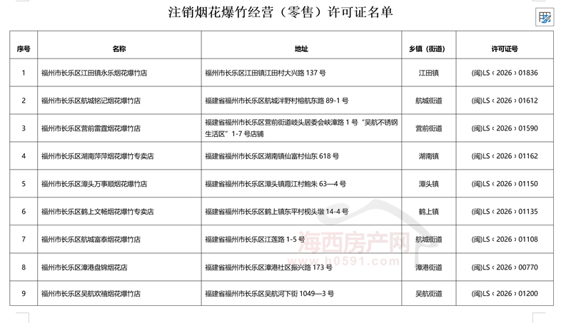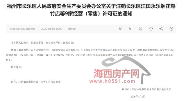海西房产网(微信公众号:fjhxfcw)消息:4月1日,福州市长乐区人民政府安全生产委员会办公室下发“关于注销长乐区江田永乐烟花爆竹店等9家经营(零售)许可证的通知”。