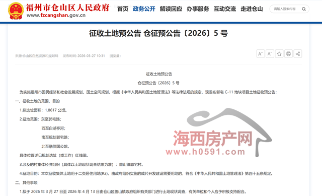 海西房产网(微信公众号:fjhxfcw)消息:为实施福州市国民经济和社会发展规划、国土空间规划,根据《中华人民共和国土地管理法》等法律法规的规定,近日仓山区自然资源和规划局发布“仓征预公告〔2026〕5 号征收土地预公告”。