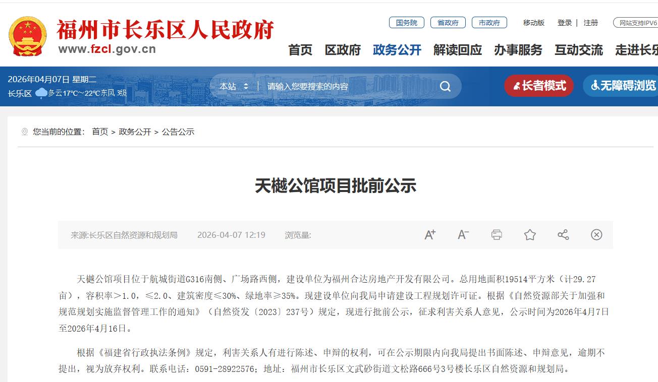 2026年4月3日,福州市长乐区自然资源和规划局发布“天樾公馆项目批前公示 ”。