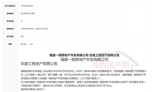 为了推动福建一顺房地产开发有限公司破产重整进程,管理人决定现就福建一顺房地产开发有限公司名下“泊岸厦湾”项目1、2号楼在建工程资产,面向社会公开招商。本次招商自公布发布之日起至2026年7月1日止。