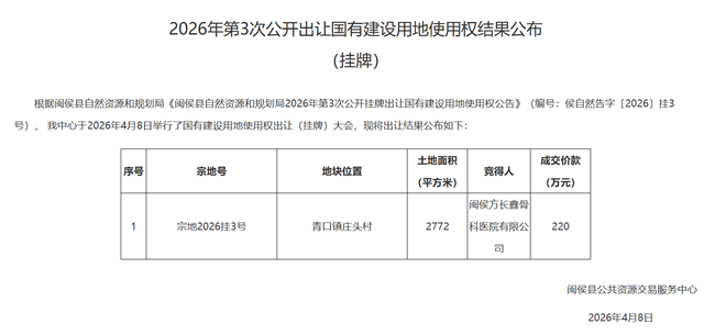 最终,闽侯方长鑫骨科医院有限公司以底价220万元竞得闽侯宗地2026挂3号,楼面价793.65元/㎡。