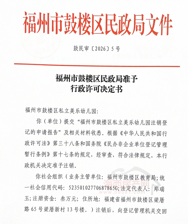 海西房产网(微信公众号:fjhxfcw)消息:4月3日,福州市鼓楼区民政局发布一则准予行政许可决定书(鼓民审〔2026〕5号)。