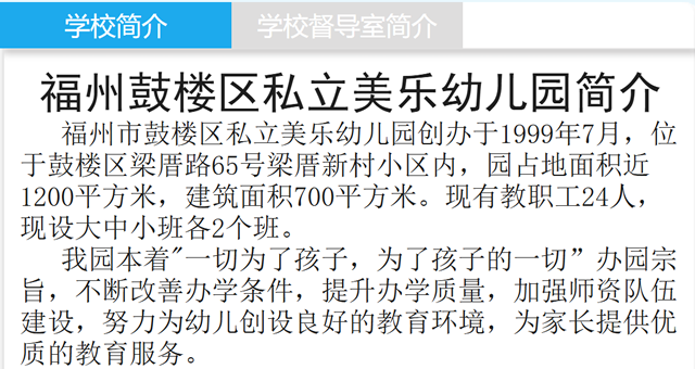 公开资料显示,福州市鼓楼区私立美乐幼儿园创办于1999年7月,位于鼓楼区梁厝路 65 号梁厝新村小区内,园占地面积近1200平方米,建筑面积 700 平方米。现有教职工24人,现设大中小班各 2 个班。