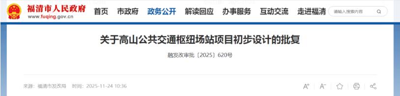 2025年11月14日,福清市发展和改革局发布“关于高山公共交通枢纽场站项目初步设计的批复”。经研究,原则同意高山公共交通枢纽场站项目(项目编码:2403-350181-04-01-252369)初步设计方案和工程概算。