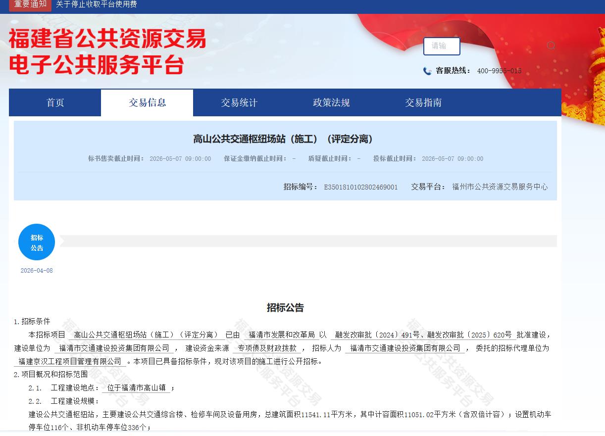 2026年4月8日,福州市公共资源交易服务中心发布“高山公共交通枢纽场站(施工)(评定分离)”。
