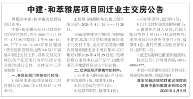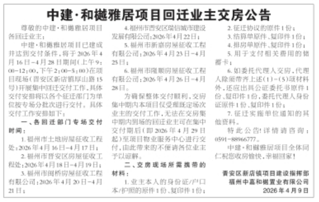 公告明确,中建·和樾雅居项目已建成并达到交付条件,将于2026年4月16日-4月28日期间(上午9:00-12:00,下午2:00-5:00)在项目现场(晋安区新店镇厚山路15号)开展集中回迁交付工作,具体交付安排将以各个征迁部门为单位按专场分批次进行交付。具体交付工作安排如下: