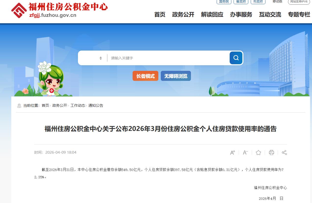 2026年4月9日,福州住房公积金中心发布“关于公布2026年3月份住房公积金个人住房贷款使用率的通告”。