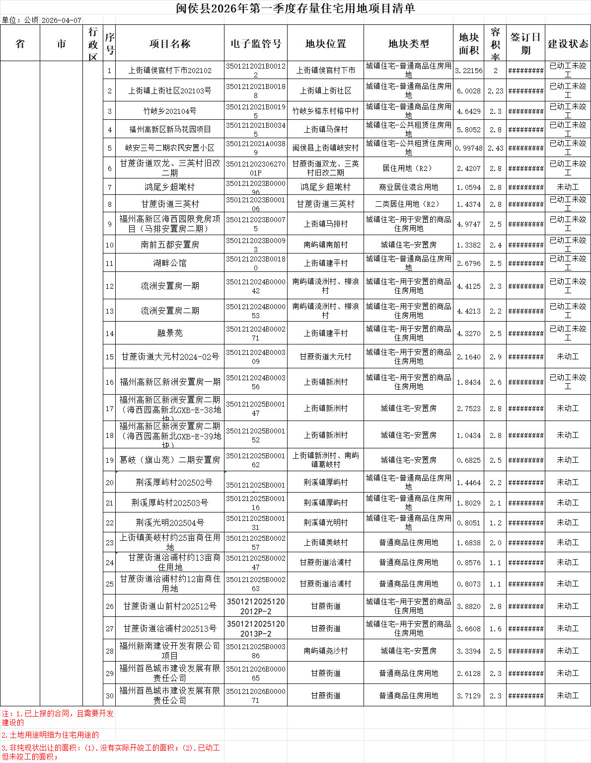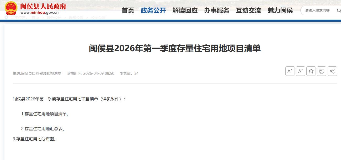 闽侯县2026年第一季度存量住宅用地项目清单(详见附件): 1.存量住宅用地项目清单。 2.存量住宅用地汇总表。 3.存量住宅用地分布图。