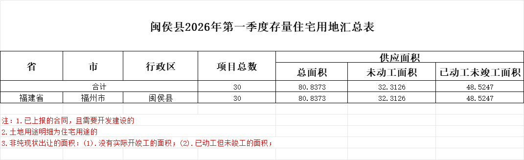 闽侯县2026年第一季度存量住宅用地项目共30个,总面积80.8373公顷(约1212.55亩)。未动工面积32.3126公顷,已动工未竣工面积48.5247公顷。