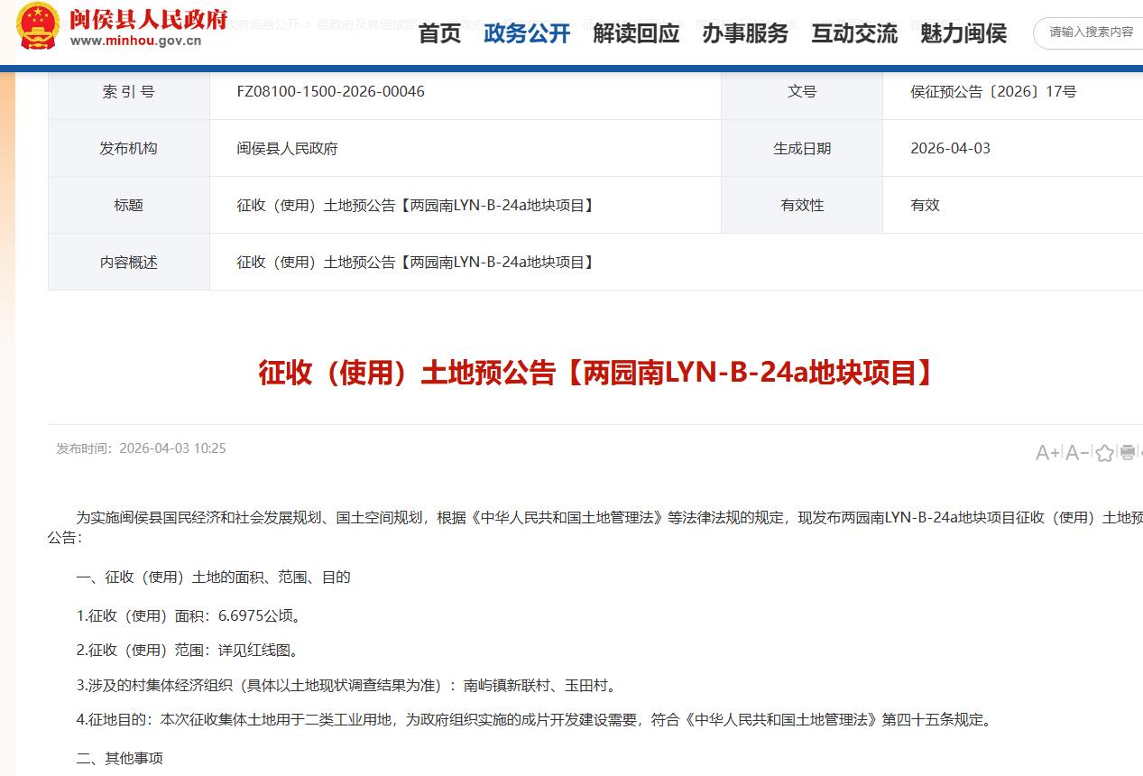 为实施闽侯县国民经济和社会发展规划、国土空间规划,根据《中华人民共和国土地管理法》等法律法规的规定,现发布两园南LYN-B-24a地块项目征收(使用)土地预公告:
