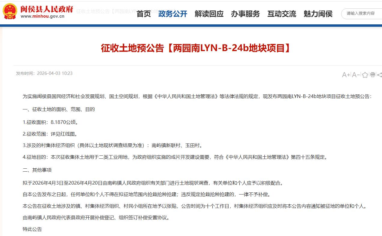 为实施闽侯县国民经济和社会发展规划、国土空间规划,根据《中华人民共和国土地管理法》等法律法规的规定,现发布两园南LYN-B-24b地块项目征收土地预公告: