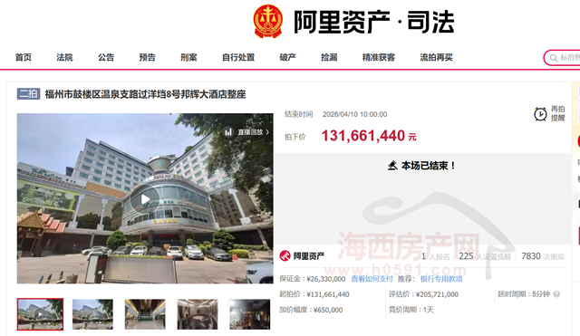 根据福清市人民法院发布的网络竞价成功确认书显示,用户姓名福州市长乐区产投产业园管理有限公司通过竞买号G5360于2026/04/10 10:00:00在阿里资产平台开展的“福州市鼓楼区温泉支路过洋垱8号邦辉大酒店整座”项目公开竞价中,以最高应价胜出。