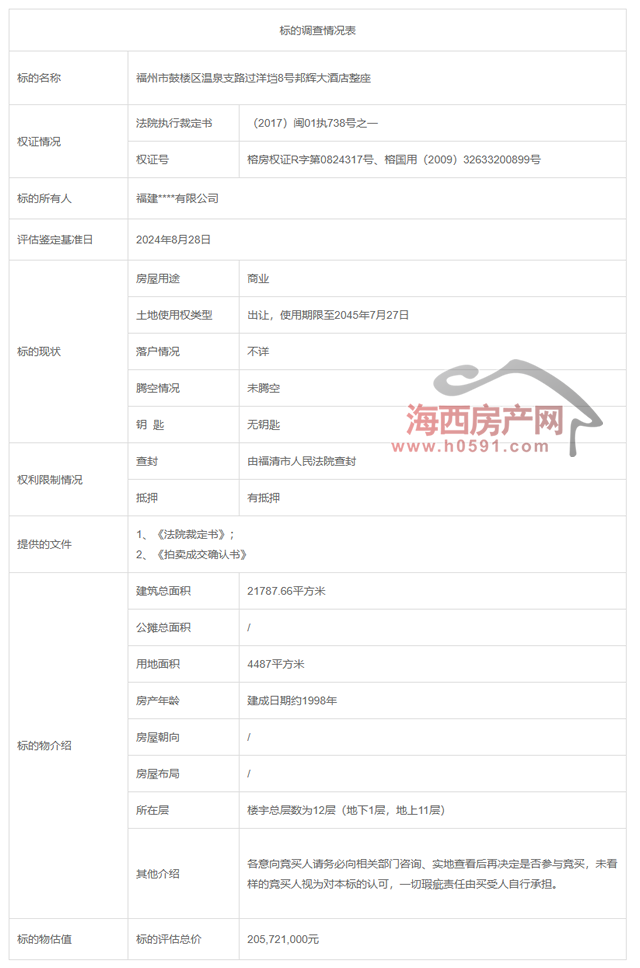 拍卖标的:福州市鼓楼区温泉支路过洋垱8号邦辉大酒店整座(权属人福建****有限公司,建筑面积21787.66㎡,土地面积为4487㎡,地类用途为商业、写字楼,房屋设计用途为服务业,实际用途均为酒店,土地使用权类型为出让,使用期限至2045年7月27日)。