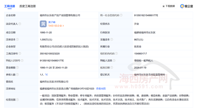爱企查资料显示,福州市长乐区产投产业园管理有限公司成立于1990年11月20日,注册地位于福建省福州市长乐区首占镇广场南路813号10层1023,法定代表人为黄子峰。
