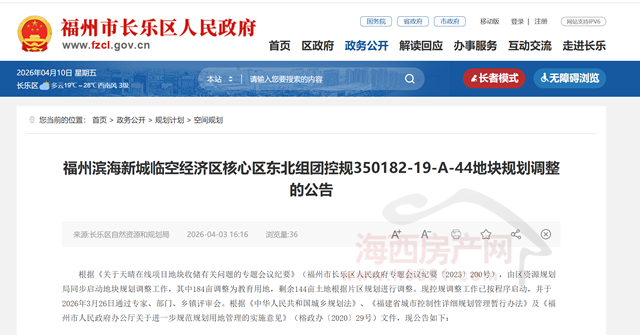 海西房产网(微信公众号:fjhxfcw)消息:4月3日,长乐区自然资源和规划局发布“福州滨海新城临空经济区核心区东北组团控规350182-19-A-44地块规划调整的公告”。