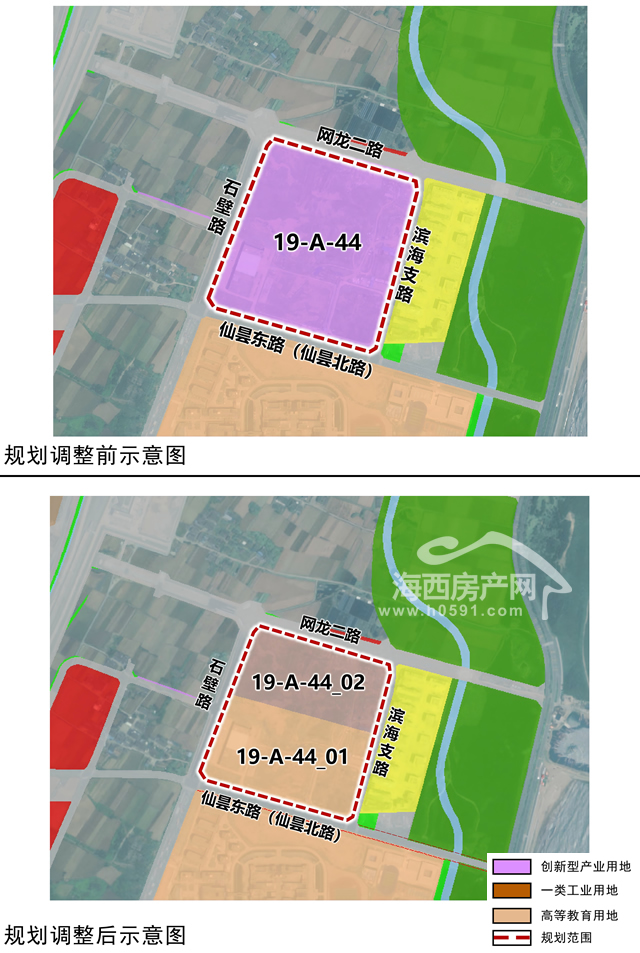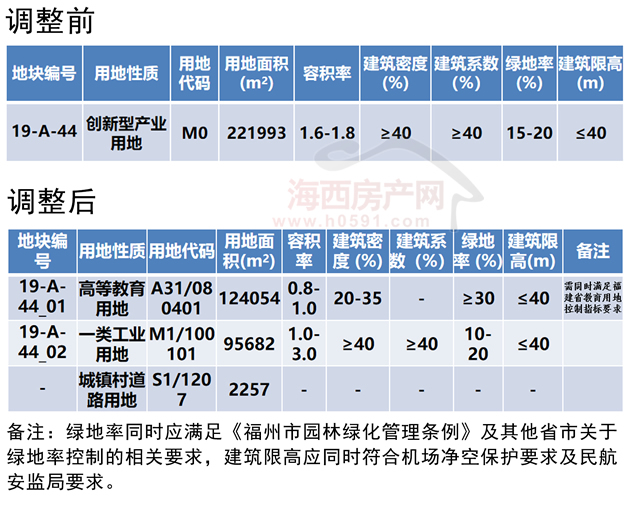 2、指标调整。19-A-44_01地块容积率由1.6-1.8调整为0.8-1.0,建筑密度由≥40%调整为20%-35%,绿地率由15%-20%调整为≥30%,其余规划控制指标保持不变;19-A-44_02地块容积率由1.6-1.8调整为1.0-3.0,绿地率由15%-20%调整为10%-20%,其余规划控制指标保持不变。绿地率同时应满足《福州市园林绿化管理条例》及其他省市关于绿地率控制的相关要求,建筑限高应同时符合机场净空保护要求及民航安监局要求,高等教育用地需同时满足福建省教育用地控制指标要求。