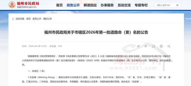 根据国务院《地名管理条例》、民政部《地名备案公告管理办法(试行)》以及《福建省地名管理办法》的有关规定,现将2026年3月27日《福州市人民政府关于文庭巷等道路名称命(更)名方案的批复》(榕政综〔2026〕54号)批复的市辖区40条道路命(更)名方案予以公告,请各单位、组织正确使用。