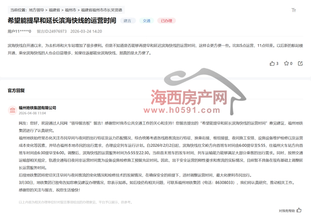 网友:您好,欢迎通过人民网“领导留言板”留言!感谢您对我市公共交通工作的关心和支持!您留言提出的“希望能提早和延长滨海快线的运营时间”意见建议,福州地铁集团进行了认真研究。