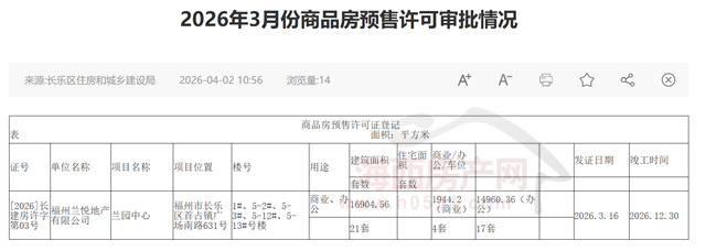 2026年3月16日,长乐“兰园中心”1#、5-2#、5-3#、5-12#、5-13#号楼21套商业、办公房源取得预售,预售面积16904.56㎡。