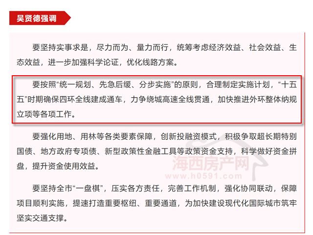 吴贤德强调,要按照“统一规划、先急后缓、分步实施”的原则,合理制定实施计划,“十五五”时期确保四环全线建成通车,力争绕城高速全线贯通,加快推进外环整体纳规立项等各项工作。