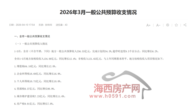 海西房产网(微信公众号:fjhxfcw)消息:4月10日,福州市财政局对外公布“2026年3月一般公共预算收支情况”。
