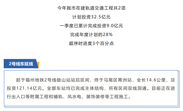 据透露,2026年福州在建轨道交通工程共2项,计划投资32.5亿元。一季度已累计完成投资9.0亿元,完成年度计划的28%,超序时进度3个百分点。