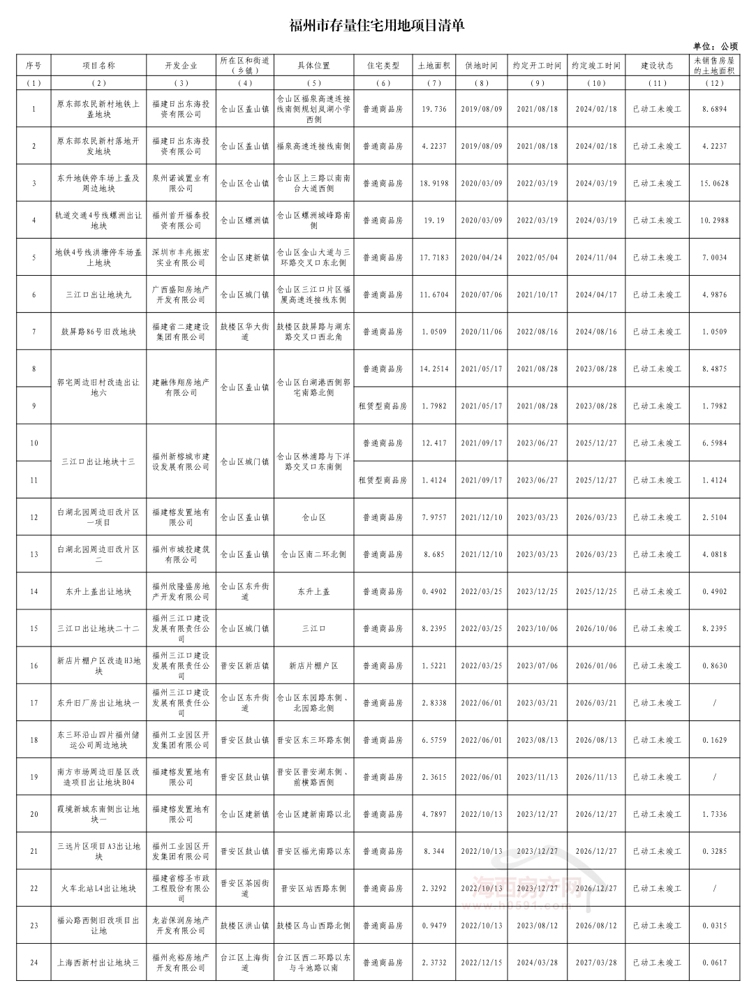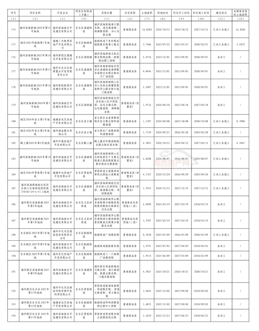 福州市存量住宅用地信息汇总表(市本级、马尾、长乐):