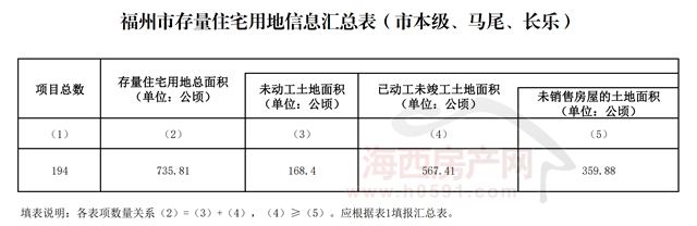 福州市存量住宅用地信息汇总表(市本级、马尾、长乐)显示,存量住宅用地总面积总面积735.81公顷(11037.15亩),未动工土地面积168.4公顷(2526亩),已动工未竣工土地面积567.41公顷(8511.15亩),未销售房屋的土地面积359.88公顷(5398.2)亩。