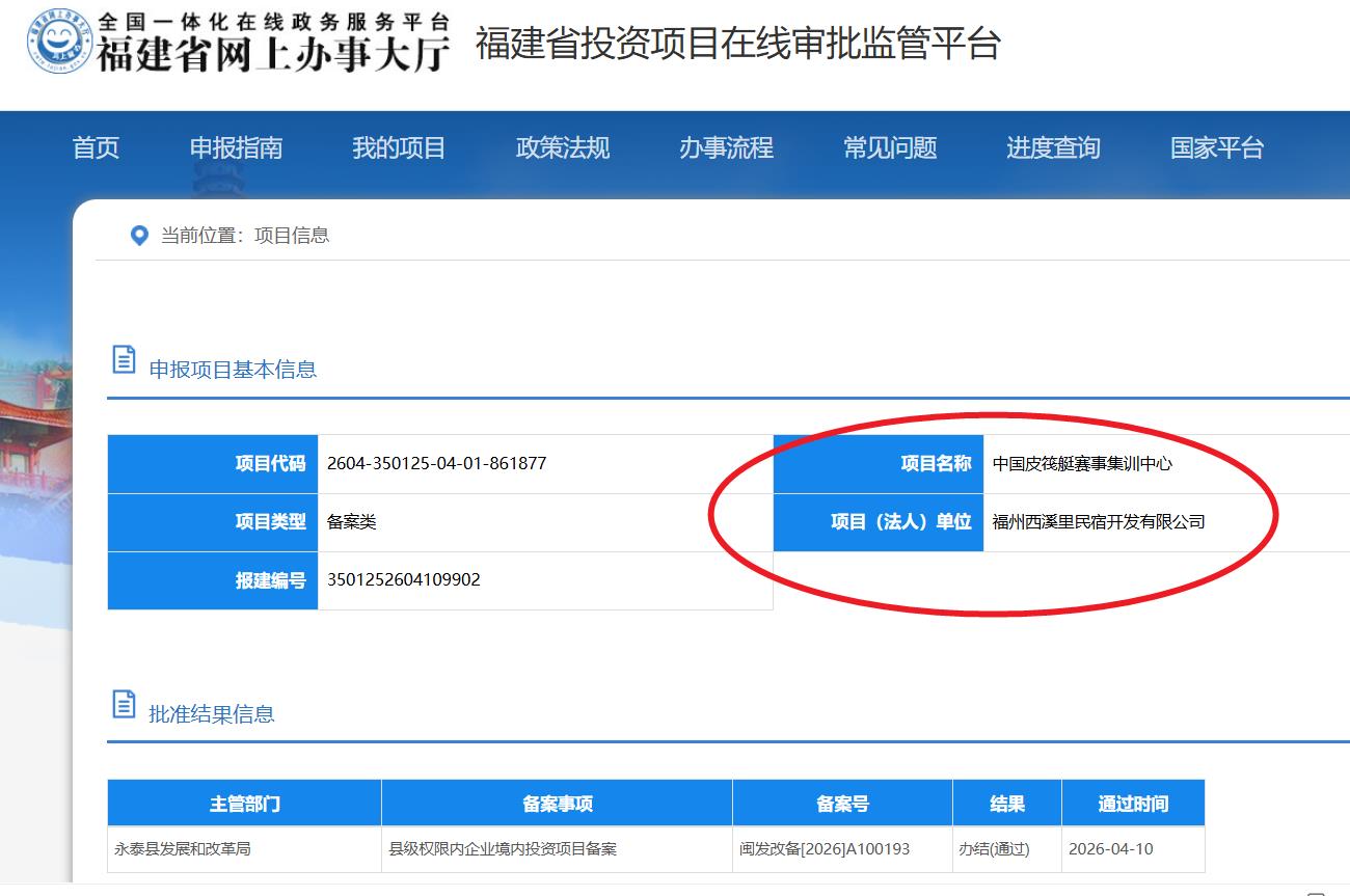海西房产网(微信公众号:fjhxfcw)消息:福建省投资项目在线审批监管平台发布信息显示,“中国皮筏艇赛事集训中心”已于2026年4月10日取得县级权限内企业境内投资项目备案,批准结果信息为办结(通过)。