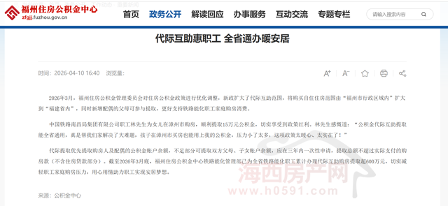 海西房产网(微信公众号:fjhxfcw)消息:2026年3月,福州住房公积金管理委员会对住房公积金政策进行优化调整,新政扩大了代际互助范围,将购买自住住房范围由“福州市行政区域内”扩大到“福建省内”,同时新增配偶的父母可参与提取,更好支持铁路能化职工家庭购房消费。