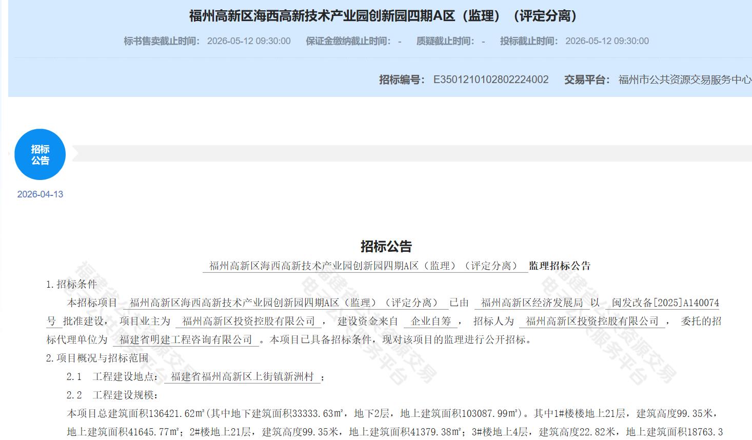 2026年4月13日,福州市公共资源交易服务中心发布“福州高新区海西高新技术产业园创新园四期A区(监理)(评定分离)监理招标公告”。