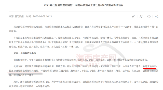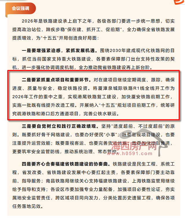 其中,会议明确,要紧抓重点项目和重要环节,将厦漳泉城际铁路R1线全线开工作为2026年工作的重中之重,实现港尾铁路复工建设,加快厦安铁路前期工作,实施一批既有线提升改造工程。
