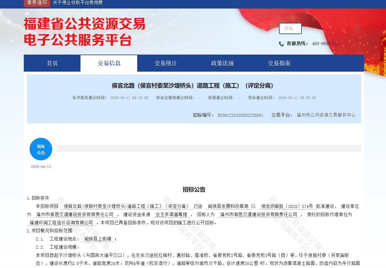 海西房产网(微信公众号:fjhxfcw)消息:4月13日,福建省公共资源交易电子公共服务平台发布“侯官北路(侯官村委至沙堤桥头)道路工程(施工)(评定分离)”。
