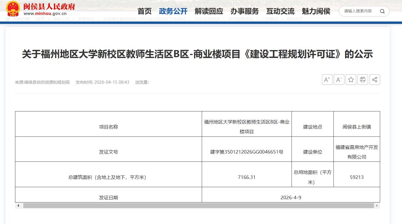 福州地区大学新校区教师生活区B区-商业楼项目取得建设工程规划许可证,发证文号建字第3501212026GG0046651号,发证日期2026年4月9日。